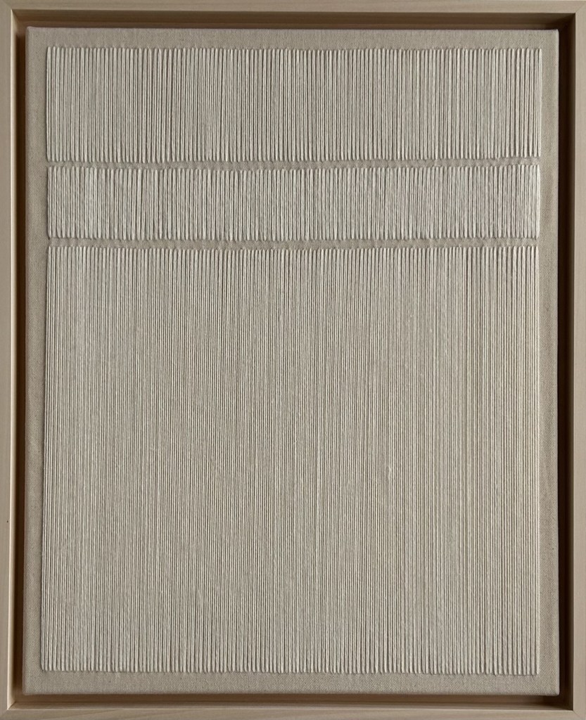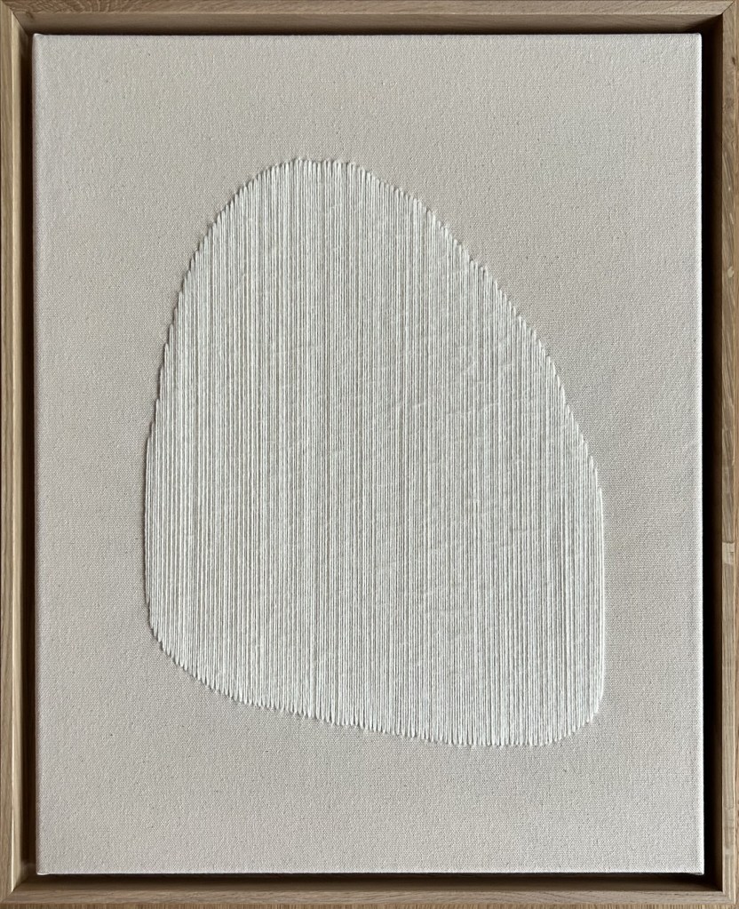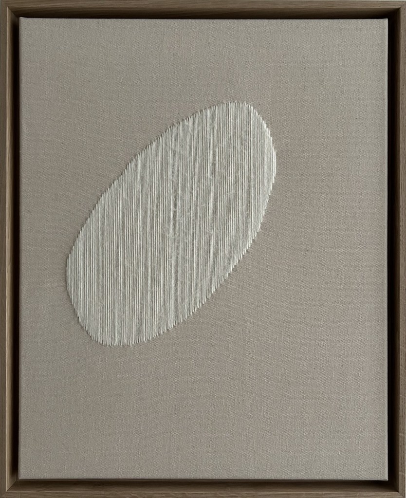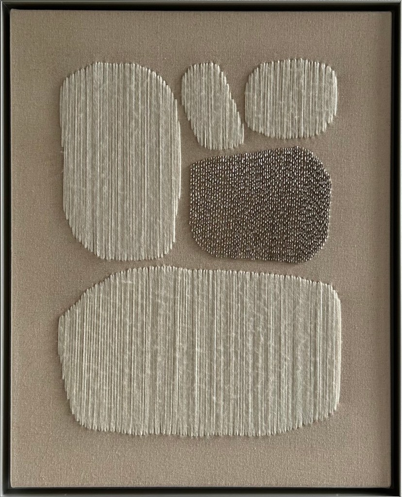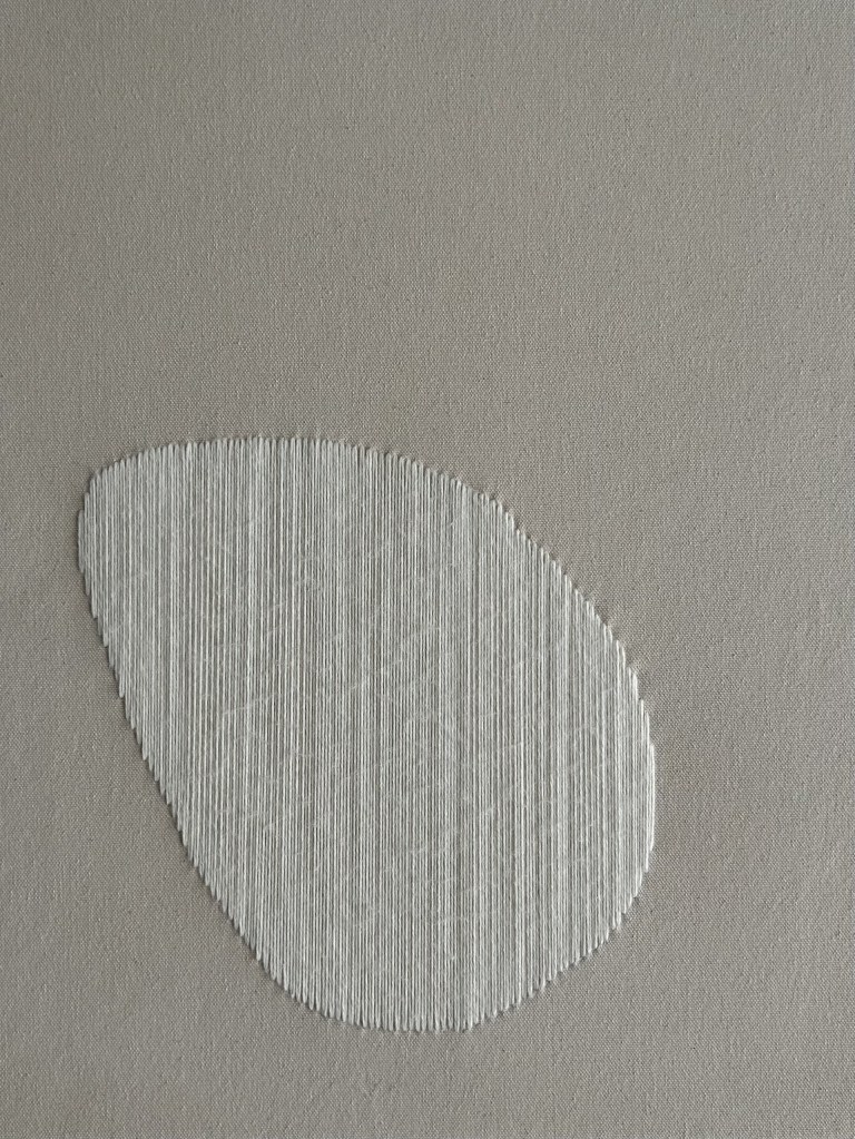 wool thread and rocailles pearls on raw canvas